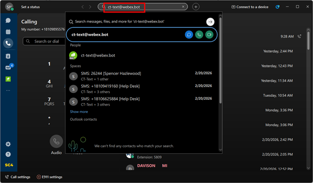In the search bar, type ct-text@webex.bot and press Enter.