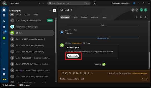 When prompted by the CT-Text bot, click Authenticate.